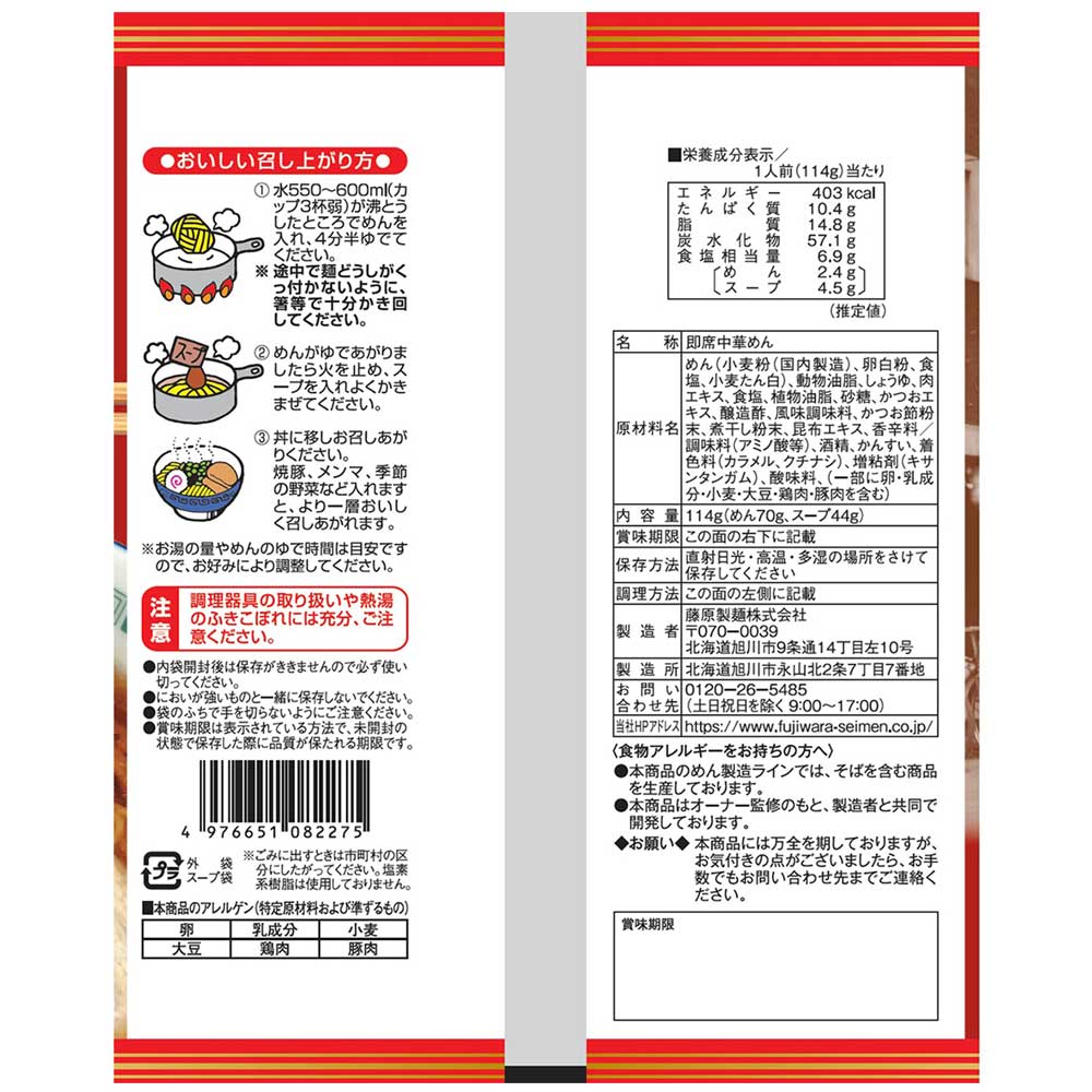 | 原材料名 | めん、小麦粉(国内製造)、卵白粉、食塩、小麦たん白、動物油脂、しょうゆ、肉エキス、食塩、植物油脂、砂糖、かつおエキス、醸造酢、風味調味料、かつお節粉末、煮干し粉末、昆布エキス、香辛料/調味料(アミノ酸等)、酒精、かんすい、着色料(カラメル、クチナシ)、増粘剤(キサンタンガム)、酸味料、(一部に卵・乳成分・小麦・大豆・鶏肉・豚肉を含む) |