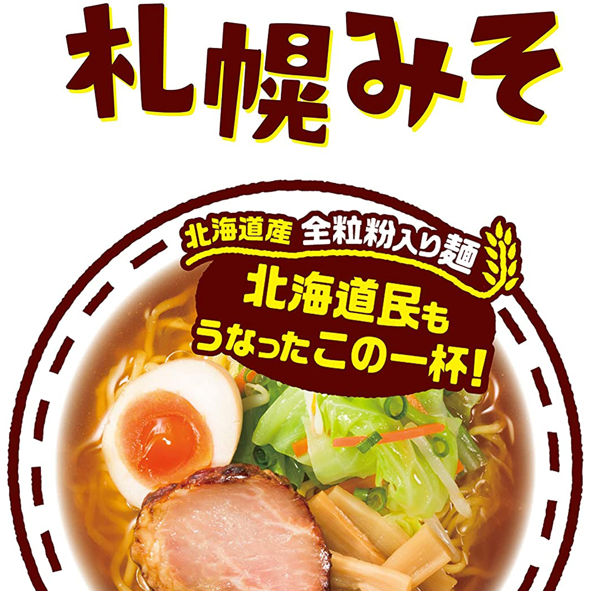 油揚げめん(小麦粉、植物油脂、小麦全粒粉、食塩、しょうゆ)、スープ(粉末みそ、食塩、糖類、香辛料、粉末しょうゆ、酵母エキス)/加工でん粉、調味料(アミノ酸等)、カラメル色素、かんすい、炭酸Ca、カロチノイド色素、香料、酸化防止剤、(ビタミンE)、香辛料抽出物、酸味料、(一部に小麦・乳成分・いか・大豆を含む) |